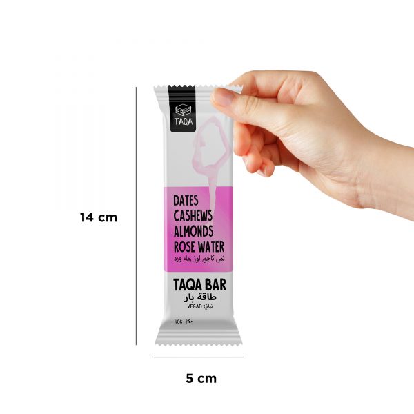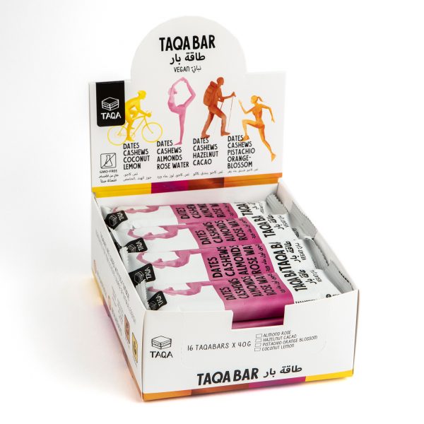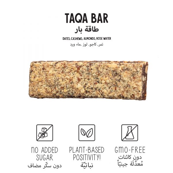 Taqabar, Almond Rose, is a compact bar of dates, cashews, roasted almonds, with a delicate aroma of rose water. It’s a bar that will quench your hunger and give you the right hint of energy to keep up with your day.