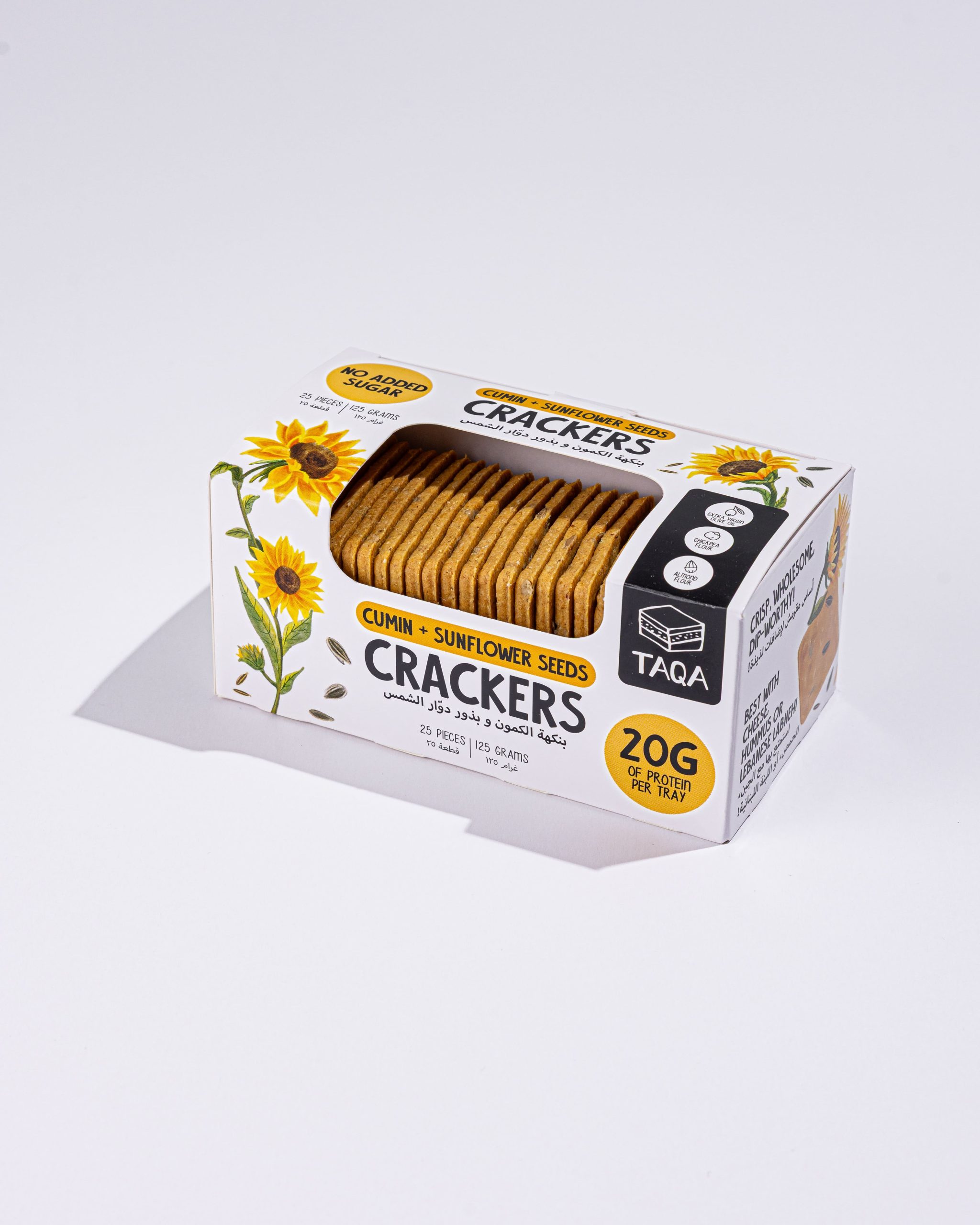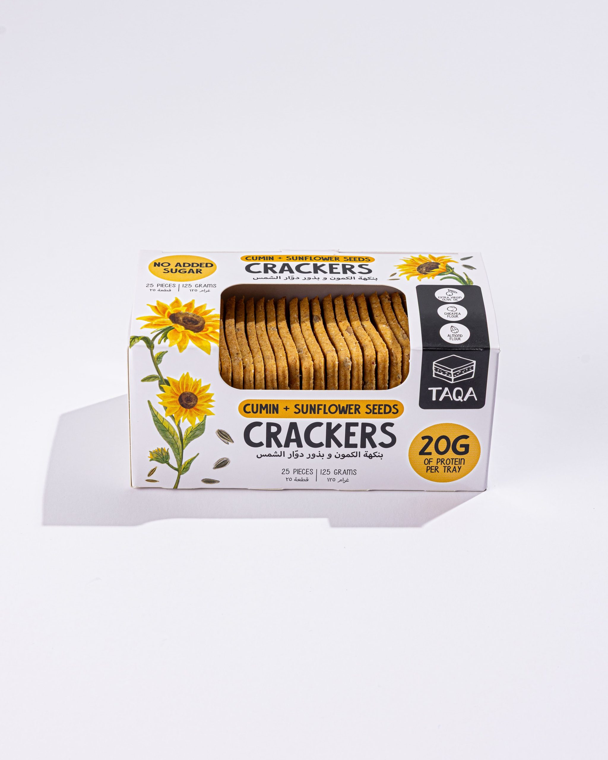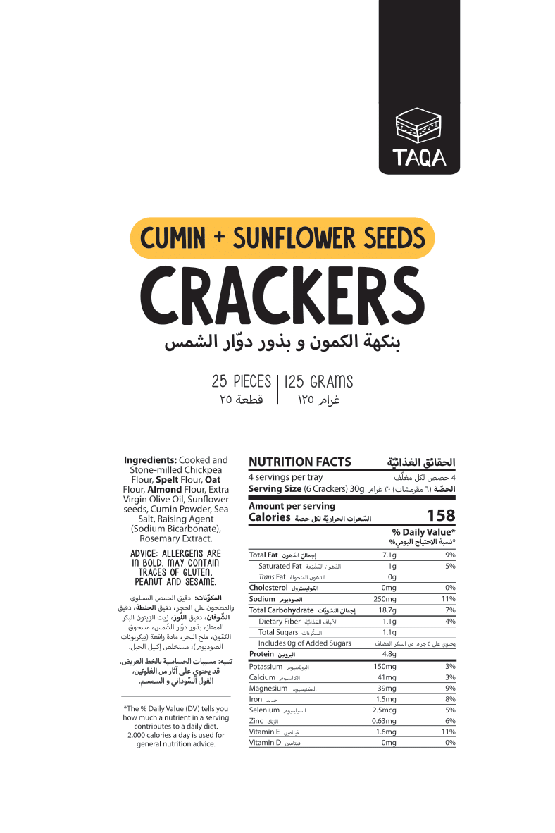 TAQA CrackersFor cumin lovers—these crackers bring the bold, earthy warmth of cumin together with the nutty crunch of sunflower seeds. A savory, satisfying bite that’s packed with protein and no added sugar.