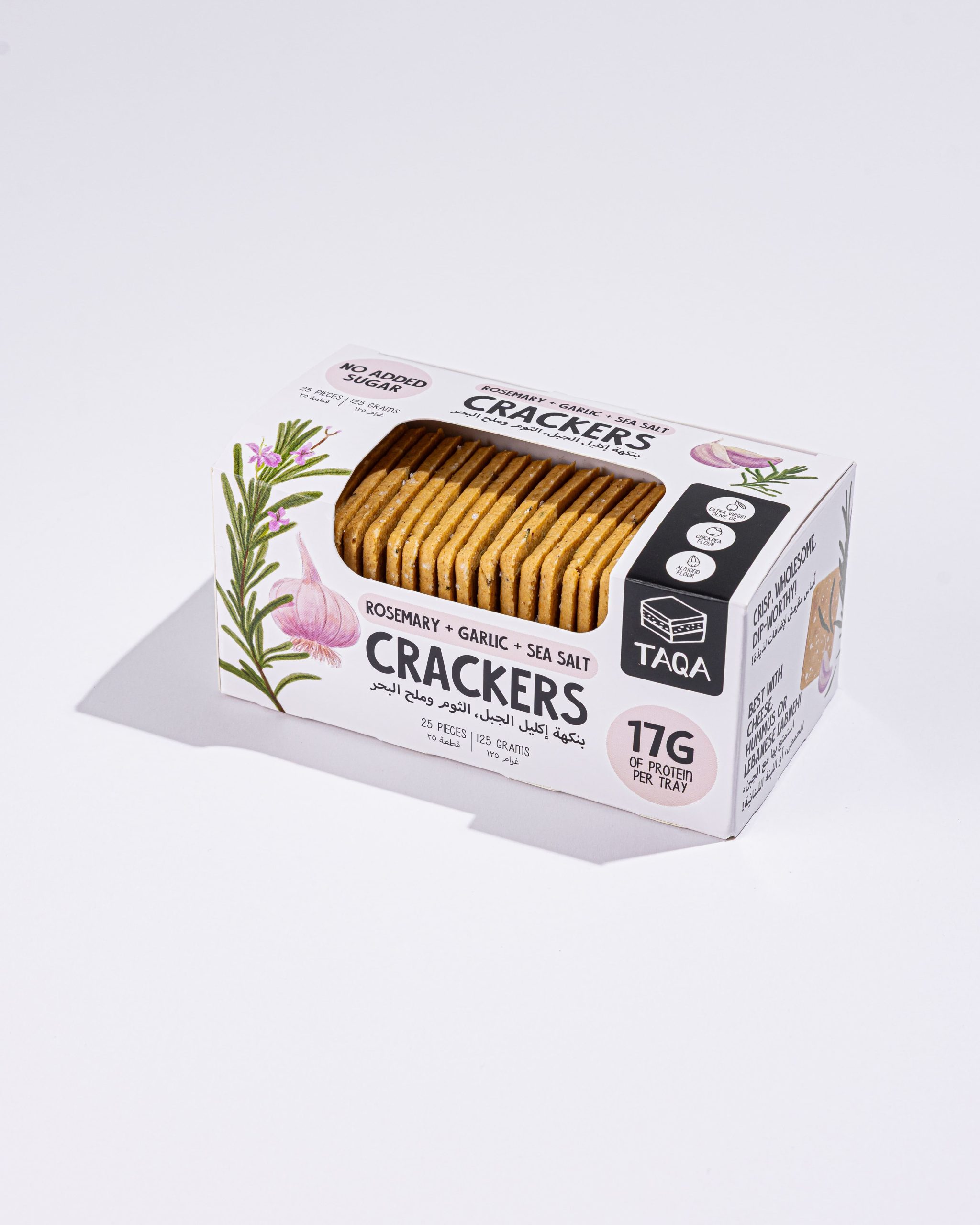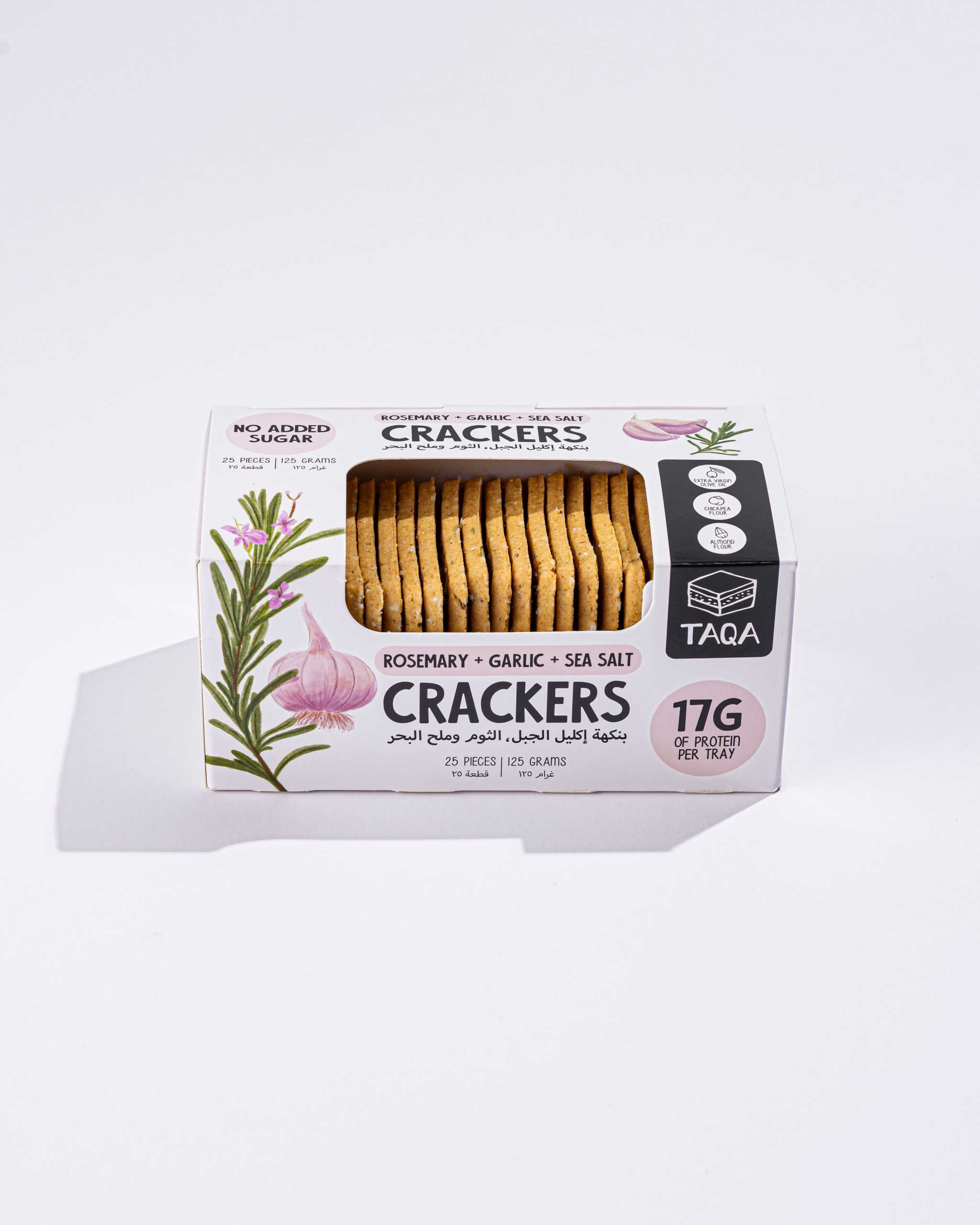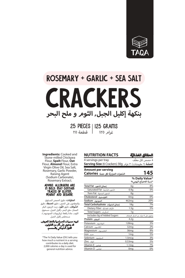TAQA CrackersCrackers infused with sun-dried rosemary, garlic, and Anfeh sea salt—hand-harvested from the Mediterranean shores. Crunchy, packed with protein, and 100% sugar-free, they bring the flavors of Lebanon to life in every bite.