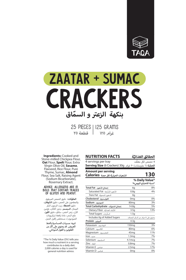 Cooked and Stone-milled Chickpea Flour, Oat Flour, Spelt Flour, Extra Virgin Olive Oil, Sesame, Flaxseed, Rice Flour, Thyme, Sumac, Almond Flour, Sea Salt, Raising Agent (Sodium Bicarbonate), Rosemary Extract.